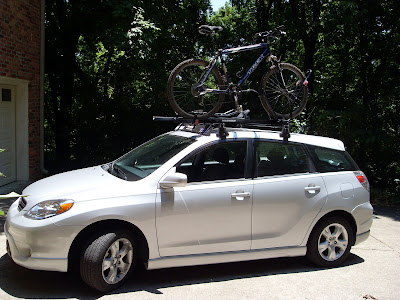 I loaded my "road bike" onto the roof of the Matrix and headed out to Percy Warner Park. First I ran the 2.5 mile trail that is up/down the whole way. This trail always pushes me and leaves me feeling stronger for it. I made a quick transition back at the car and road 18 miles on the bike before transitioning at the car again and heading out on one more loop of the 2.5 trail run. I felt great and love the feeling of a great summer workout that leaves you dripping in sweat.